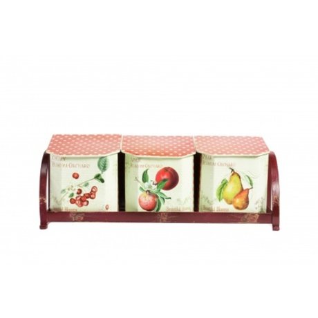 Красивые металлические баночки на элегантной подставке гармонично впишутся в современный кухонный интерьер. Они предназначены для хранения чая, кофе, сахара и других полезных, но сыпучих продуктов. Каждая баночка украшена оригинальным фруктовым рисунком.