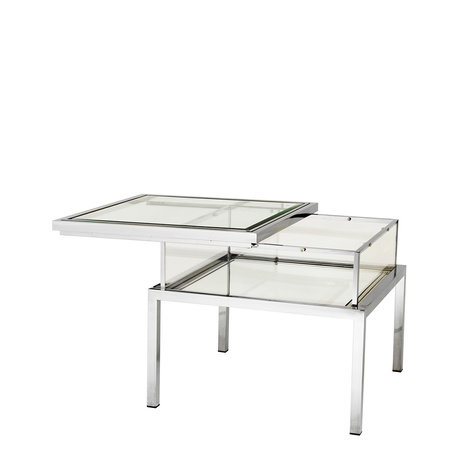 Приставной столик Side Table Harvey rectangular выполнен из полированной нержавеющей стали. Столешница и бортики из плотного прозрачного стекла. Столешница выдвижная, внутри столика можно разместить декор.
